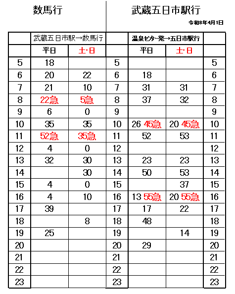 武蔵五日市駅↔温泉センター時刻表